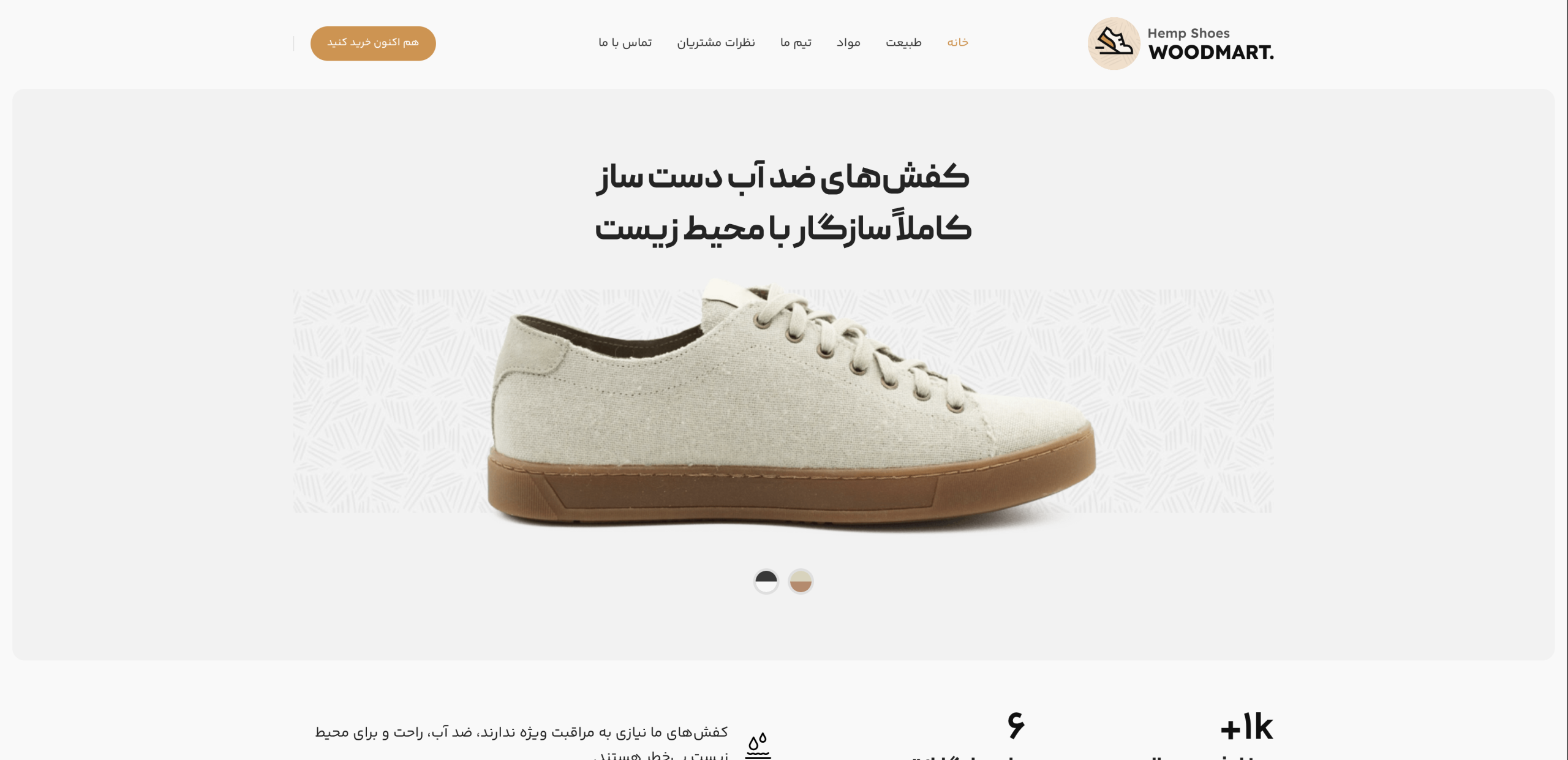 - • نمایش حرفهای محصولات: تصاویر با رزولوشن بالا از کفشهای کنفی، دکمههای خرید مشخص و گزینه انتخاب رنگ، روند خرید را تسهیل میکند.