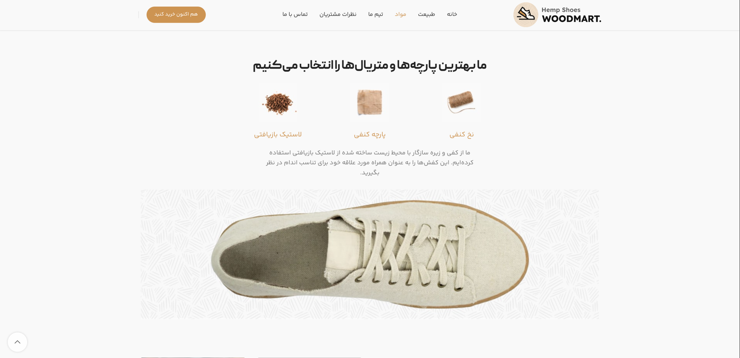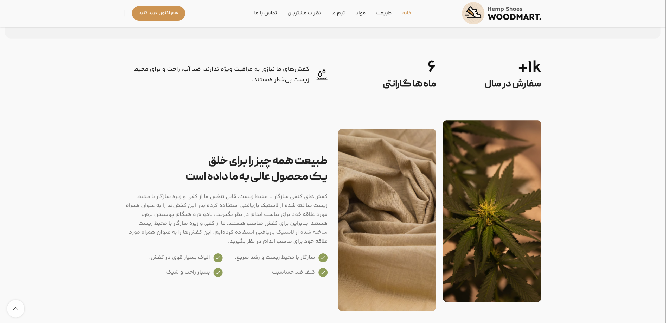 - • بخشهای تعاملی: نمایش واضح مواد اولیه (کنف، پارچه، چرم) و تیکهای تایید ویژگیها، اعتماد مشتری را جلب میکند.