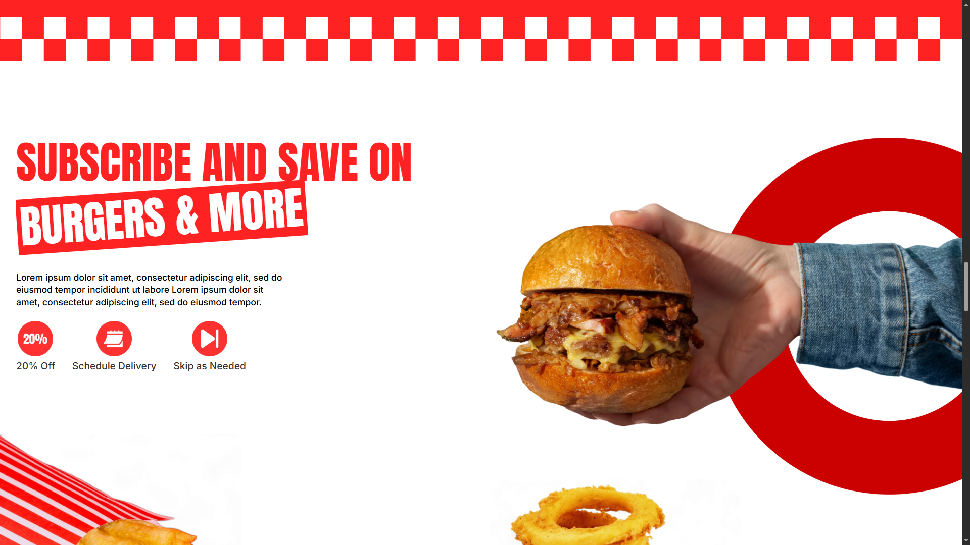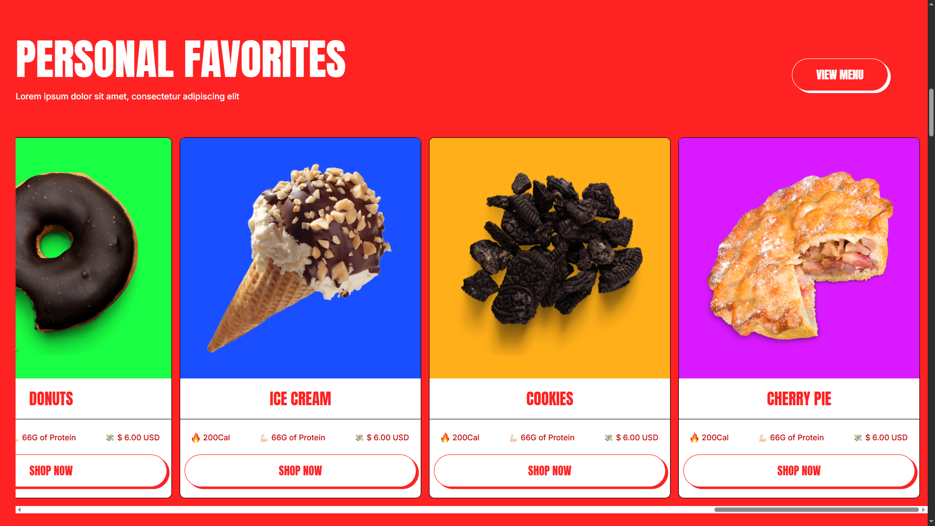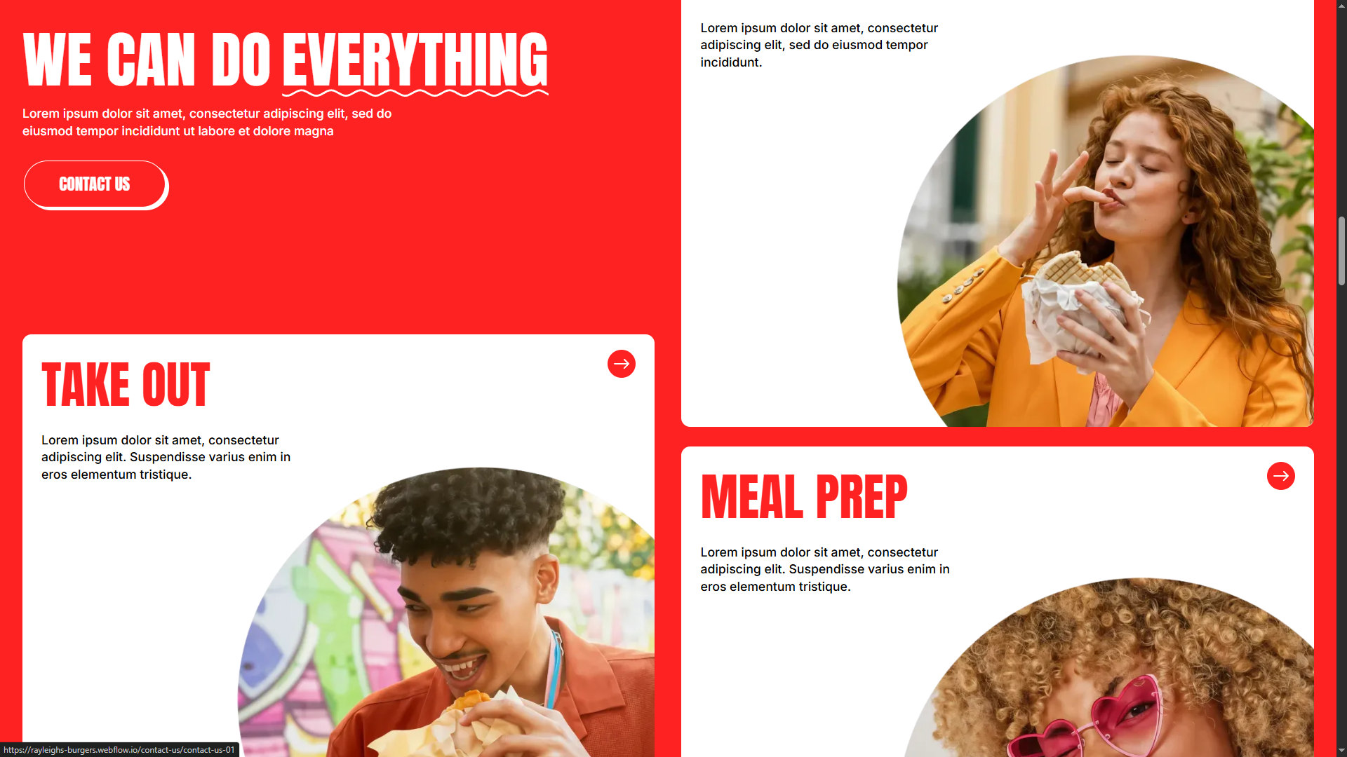 صفحه اصلی قالب با رنگ قرمز غالب و تایپوگرافی برجسته، فوراً توجه مخاطب را جلب میکند. طراحی این صفحه، با الهام از فضای صمیمی یک رستوران مدرن، حس حرفهای و مهماننوازی را منتقل میکند. بخش Hero با پیام برند و دکمه دعوت به اقدام کاملاً واضح، کاربر را از همان ابتدا به تعامل دعوت میکند. ساختار صفحه با بخشهای منظم گالری غذا، دستهبندیهای مشخص و منوی خلاقانه , تجربه کاربری یکپارچه و جذابی را ارائه میدهد و کاربران را قدم به قدم به خدمات بیشتر هدایت میکند.